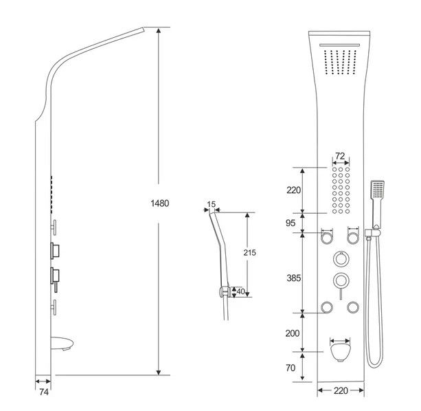• Комплектация: душевая панель, душевая лейка, смеситель, шланг для душа, верхний душ, крепеж, инструкция