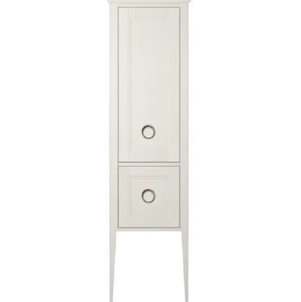 Высокий напольный пенал из массива ясеня с эффектом открытой поры, с распашной дверцей и выдвижным ящиком. Фасад украшен классической фурнитурой. Пространство за дверцей разделено несколькими регулируемыми полками. Петли для крепления дверцы расположены справа.