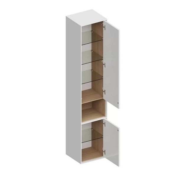 Высокий подвесной пенал в белом глянцевом цвете из МДФ c двумя дверцами и одной открытой полкой в цвете «дуб Виченца». Фасады оснащены скрытой системой открывания Push-to-open. Внутри установлено несколько стеклянных полок с возможностью регулировки по высоте. Петли для крепления дверец расположены справа. Изделия из ДСП, МДФ, а также изделия из металла требуют правильного ухода и эксплуатации. При установке и дальнейшей эксплуатации изделий, следует обратить внимание на их расположение в ванной комнате: они должны быть установлены вдали от источников тепла; температура воздуха в помещении должна быть в пределах +2 — +25 °С, а влажность воздуха не должна превышать 45%-70%. Во избежание появления пятен, отслоения облицовки и коррозии металла, не допускать скопления воды и жидкостей на поверхностях изделий и как можно скорее протереть сухой мягкой тканью участок, контактирующий с жидкостью. Соблюдайте правила ухода за изделиями из металла и они прослужат Вам очень долго.