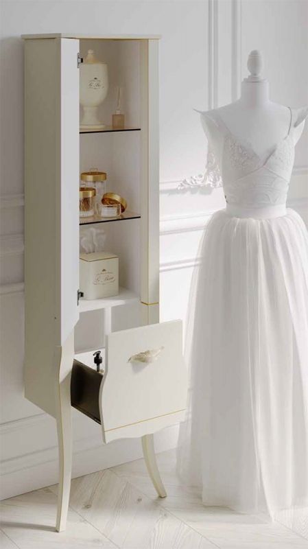 Шкаф пенал Clarberg Borgia 48 BOR0548BG с одной распашной дверцей, выполненный в духе современной классики, отличается утонченными и изящными формами, которые подчеркивает патина под золото. Ручки в виде листьев эффектно дополняют образ мебели.