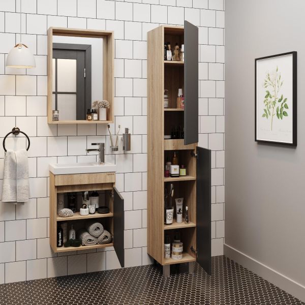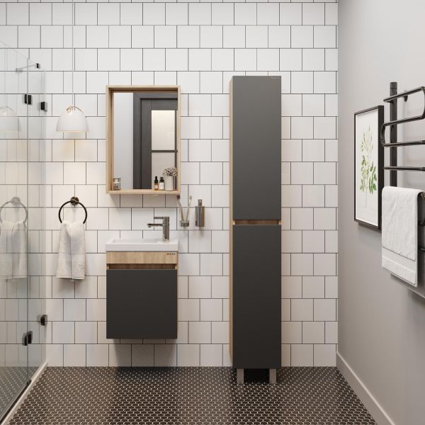 Напольный пенал для ванной комнаты Onika Милтон 30 сочетает в себе контрастные цвета и фактуры: серый матовый фасад с покрытием SoftTouch прекрасно гармонирует с корпусом цвета дуб сонома с роскошной текстурой.