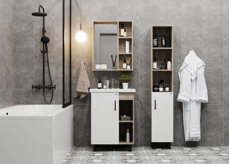 Открытые полки сверху обеспечивают быстрый доступ к часто используемым аксессуарам, а пространство за распашной дверцей снизу, снабженной системой плавного закрывания, станет удобным местом для хранения различных бытовых принадлежностей.
