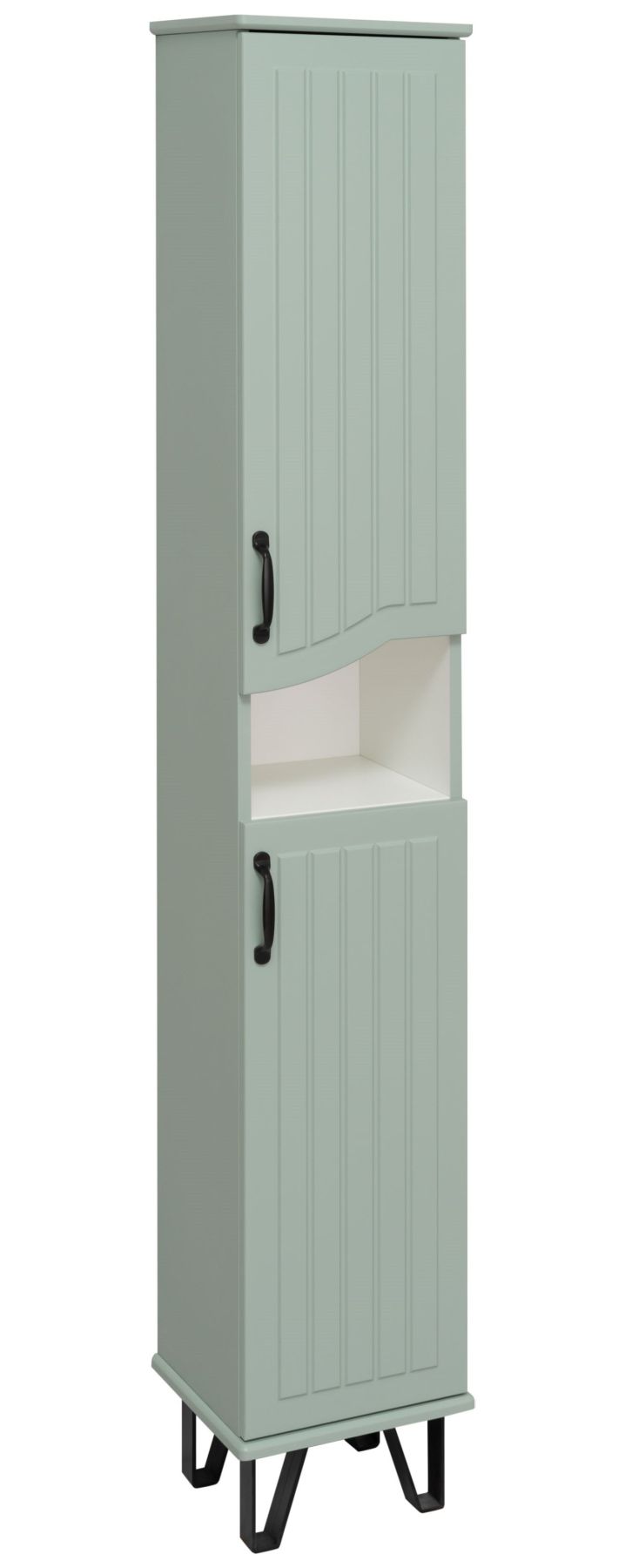 Шкаф-колонна напольный с двумя распашными дверками и открытой нишей посередине. В верхнем и нижнем отделениях по одной встроенной полке. Петли со встроенным доводчиком, ножки черные пластиковые -4шт, ручки черные -2шт. Корпус и фасады покрыты пленкой в цвете мята, что в сочетании с черной фурнитурой делают мебель стильной и оригинальной. Выпускается только в правом исполнении.