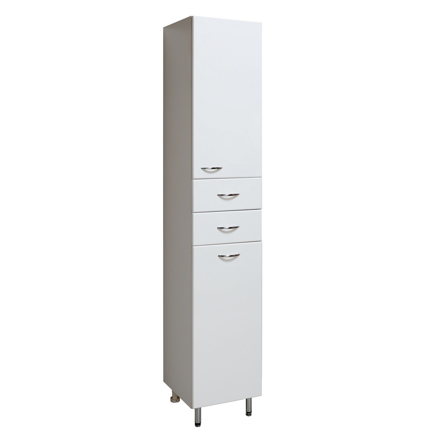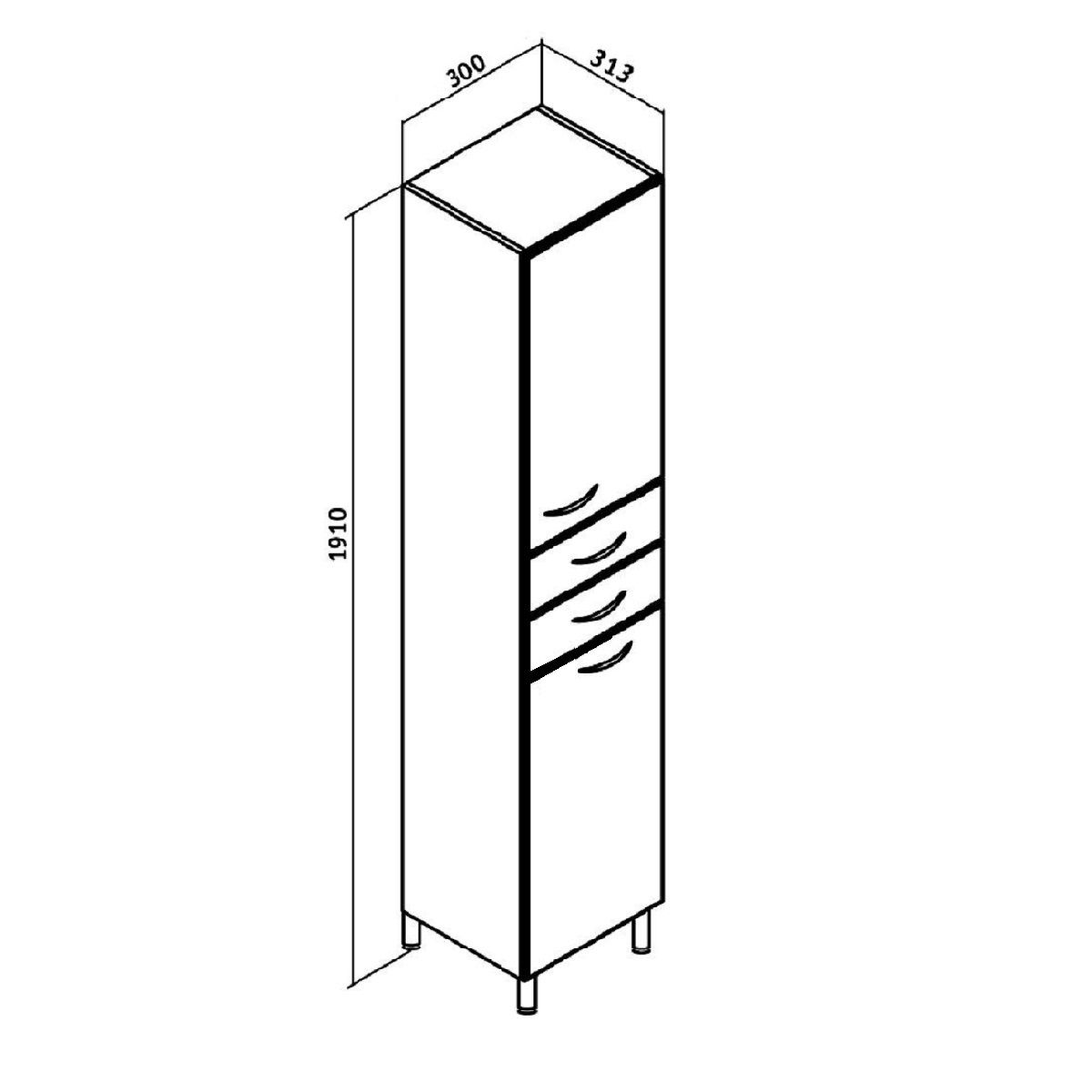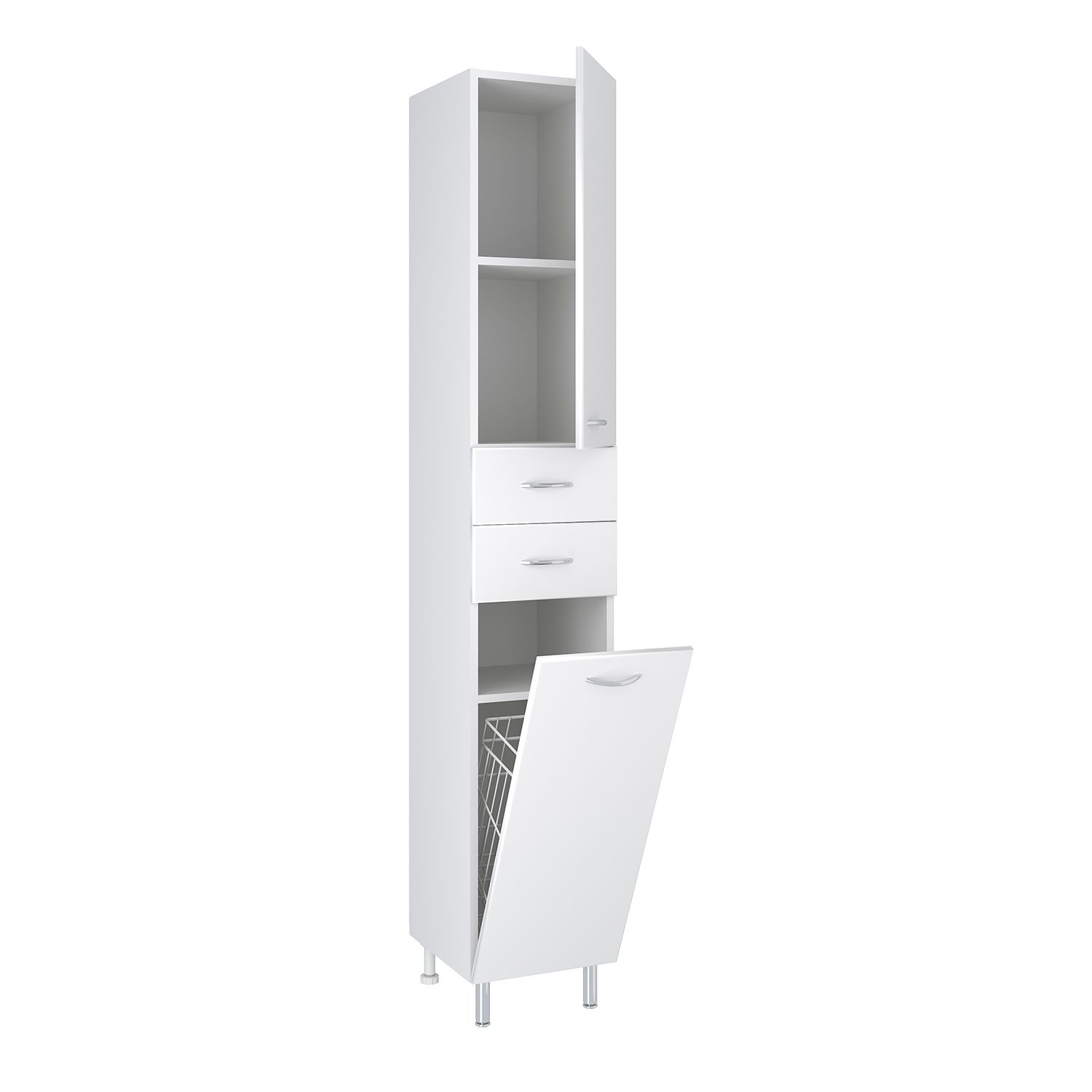 Шкаф-колонна напольный с двумя отделениями и выдвижными ящиками. Верхнее отделение с распашной дверкой и одной внутренней полкой. Нижнее отделение - с откидной дверью. Комплектуется полкой и корзиной для белья. Ящики - на шариковых направляющих, петли со встроенным доводчиком, ручки - 4 шт, ножки хром - 2 шт, ножки пластик -2шт.