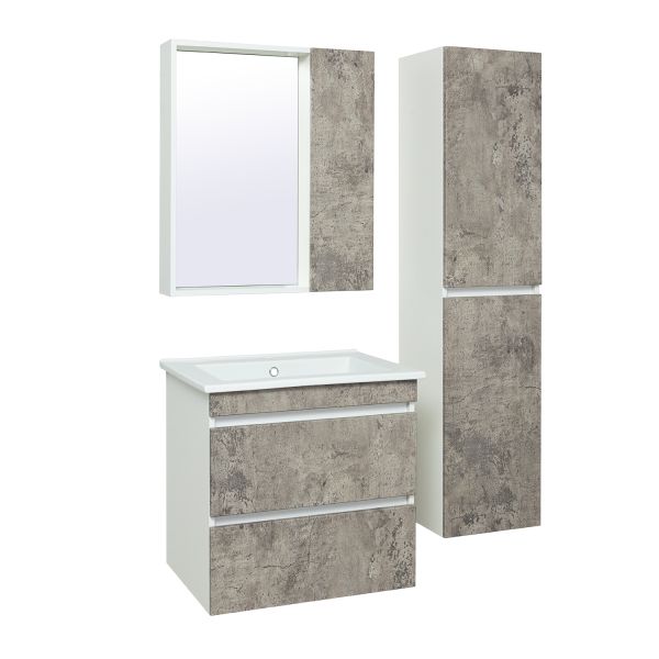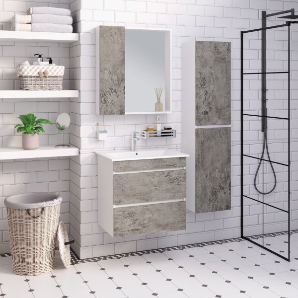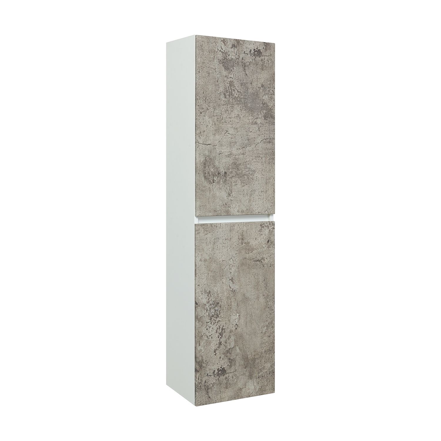 Шкаф-колонна подвесной с двумя отделениями и распашными дверками. В каждом отделении по одной встроенной полке. Петли со встроенным доводчиком, подвес -2шт. Шкаф универсальный (для смены ориентации товар поворачивается на 180 градусов). Корпус изделий изготовлен из белого ЛДСП, а фасады облицованы матовой пленкой ПВХ цвета "серый бетон".