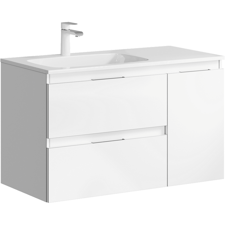 Подвесная тумба под раковину Aqwella Accent ACC0109LW 90 смПодвесная тумба с двумя ящиками и одной дверью в белом цвете с умывальником из литьевого мрамора (чаша слева)