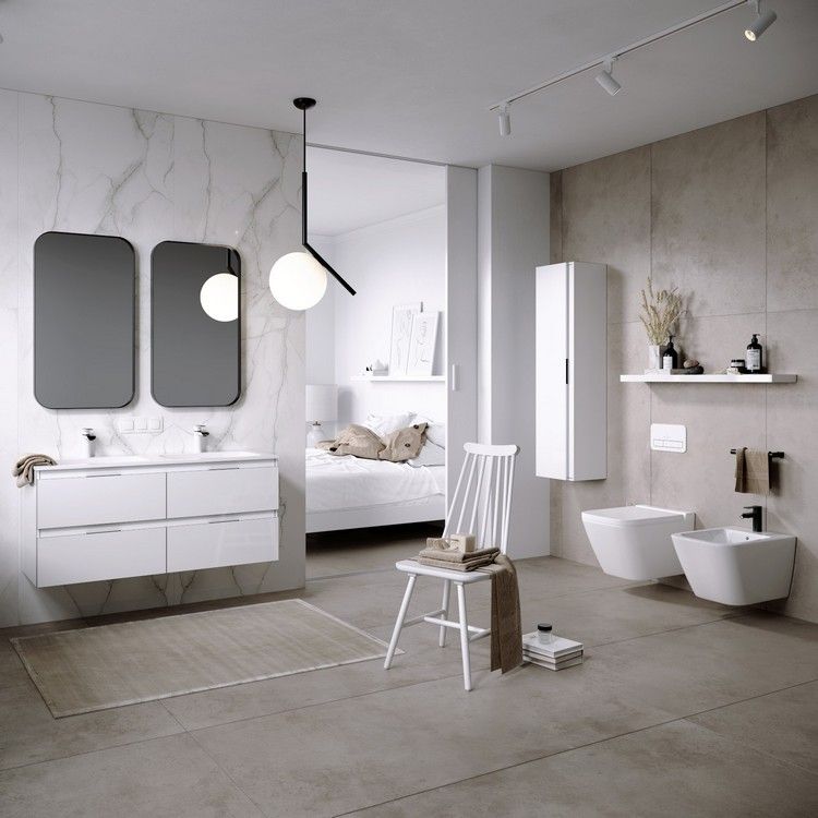 Подвесная тумба с четырьмя ящиками в белом цвете с умывальником из литьевого мрамора