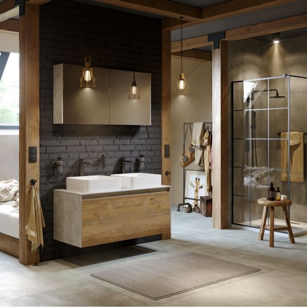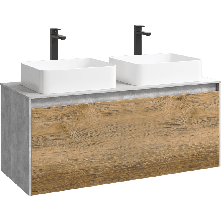 Подвесная тумба под раковину Aqwella Mobi MOB0112BS+MOB0712DB 120 смПодвесная тумба 120 см с двумя ящиками: основной и внутренний, скрытый за фасадом. Цвет бетон светлый/дуб балтийский; с умывальником