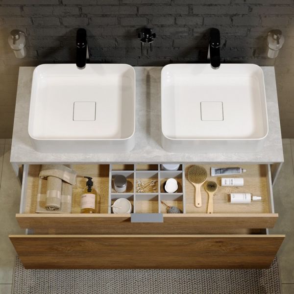 Подвесная тумба под раковину Aqwella Mobi MOB0112DB+MOB0712BS 120 смПодвесная тумба 120 см с двумя ящиками: основной и внутренний, скрытый за фасадом. Цвет дуб балтийский/бетон светлый; с умывальником