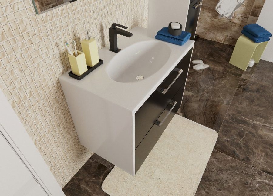 Коллекция Vegas разработана в современном стиле с учетом комфорта и функциональности. За счет вкладных фасадов мебель возможно выполнить в двухцветном исполнении абсолютно в любом сочетании (по каталогу RAL). Vegas дает возможность исполнить индивидуальное решение. Тумба укомплектована раковиной из литьевого мрамора с геометрическими формами. Сама раковина прямоугольная, чаша овальная, что дает комплекту дополнительную изысканность. В тумбе располагаются 2 ящика, максимально удобные для хранения и функционального размещения.