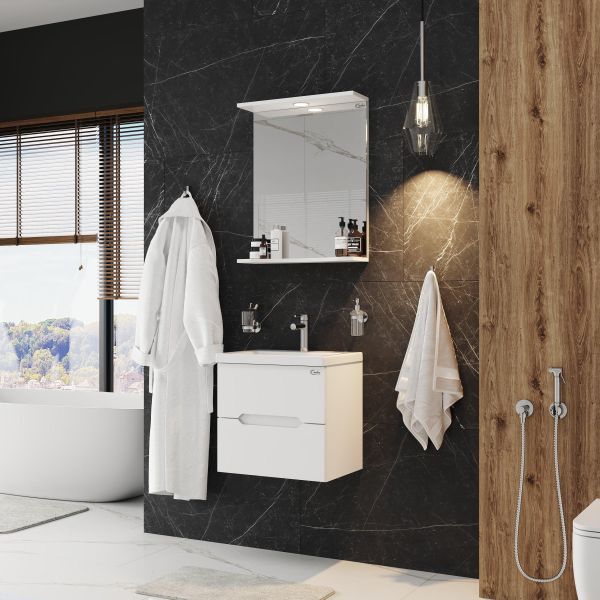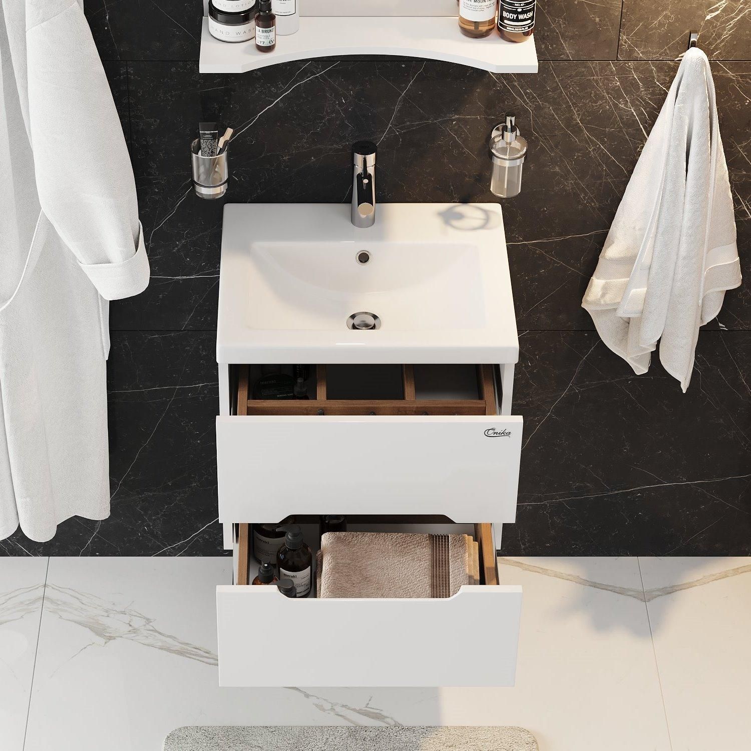 Подвесная тумба для ванной комнаты Onika Айленд 50 сочетает в себе стильный минималистичный дизайн, белую глянцевую поверхность и высочайшее качество исполнения.
