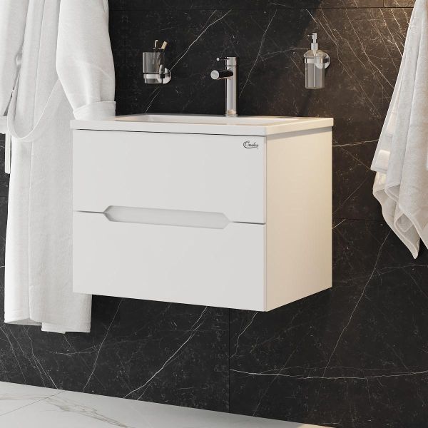 Подвесная тумба под раковину Onika Айленд 60 сочетает в себе стильный минималистичный дизайн, белую глянцевую поверхность и высочайшее качество исполнения.