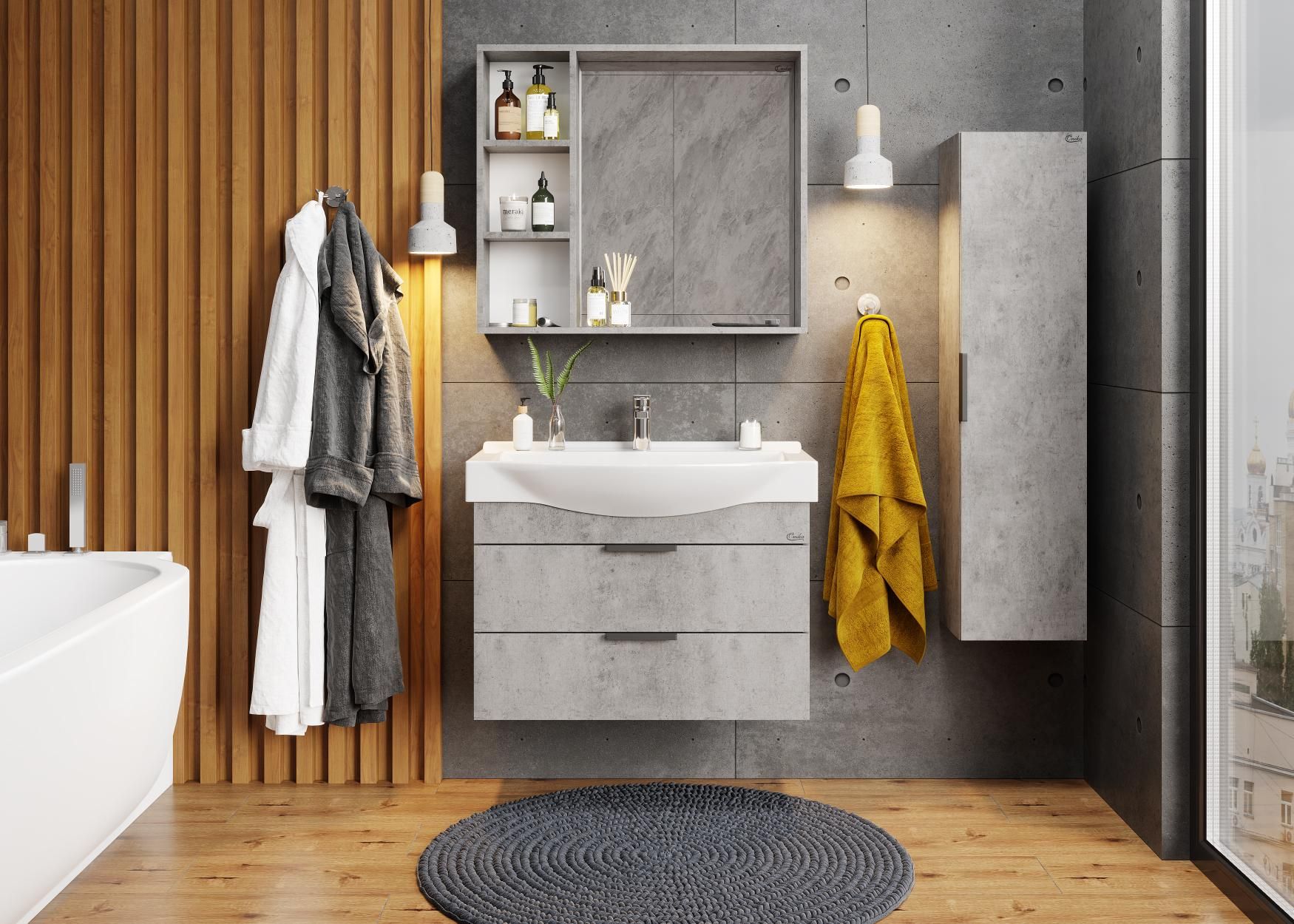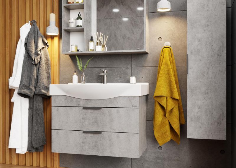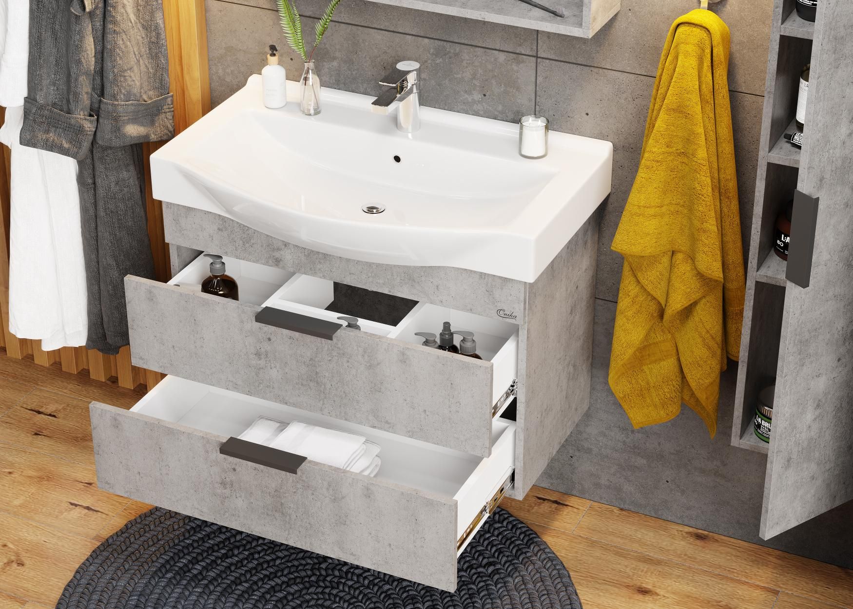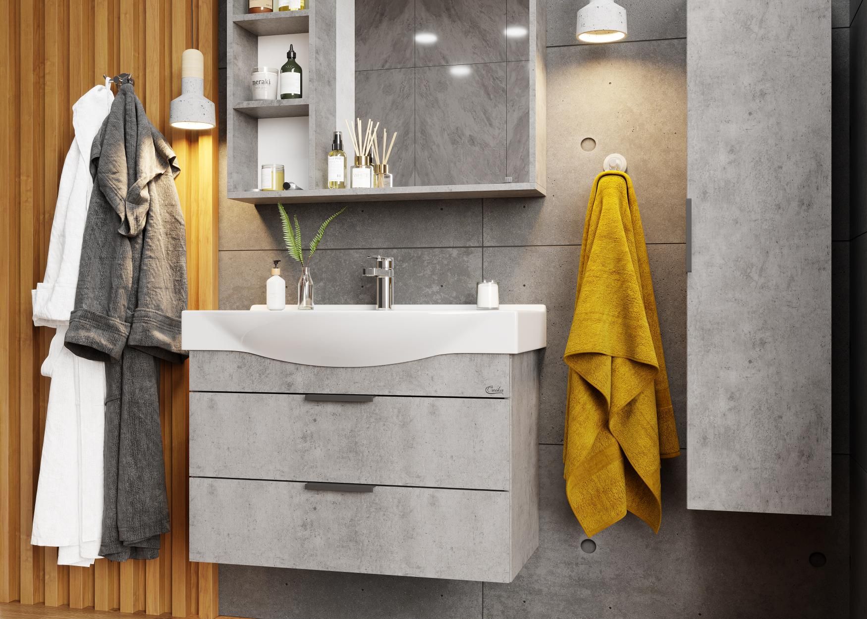 Подвесная тумба для ванной комнаты Onika Девис 80 отличается чёткой геометрией форм и создана для тех, кто ценит современный лаконичный дизайн, холодный брутальный эффект бетона, а также безупречное исполнение.