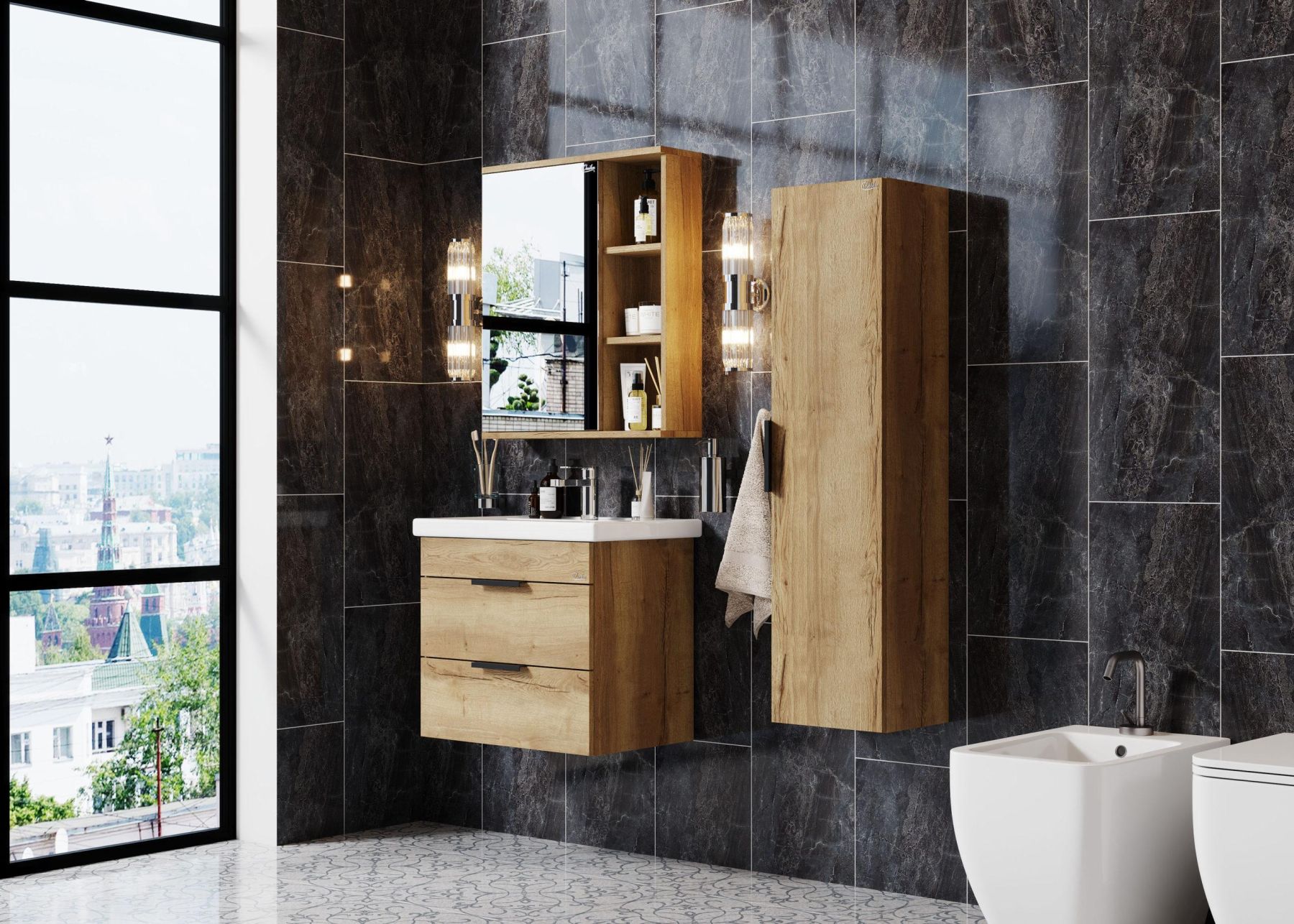 Подвесная тумба для ванной комнаты Onika Легран 60 - это сочетание насыщенного древесного декора и благородства металла: роскошная текстура и натуральный цвет дуба дают теплоту, а матовые металлические ручки добавляют урбанизма и солидности.