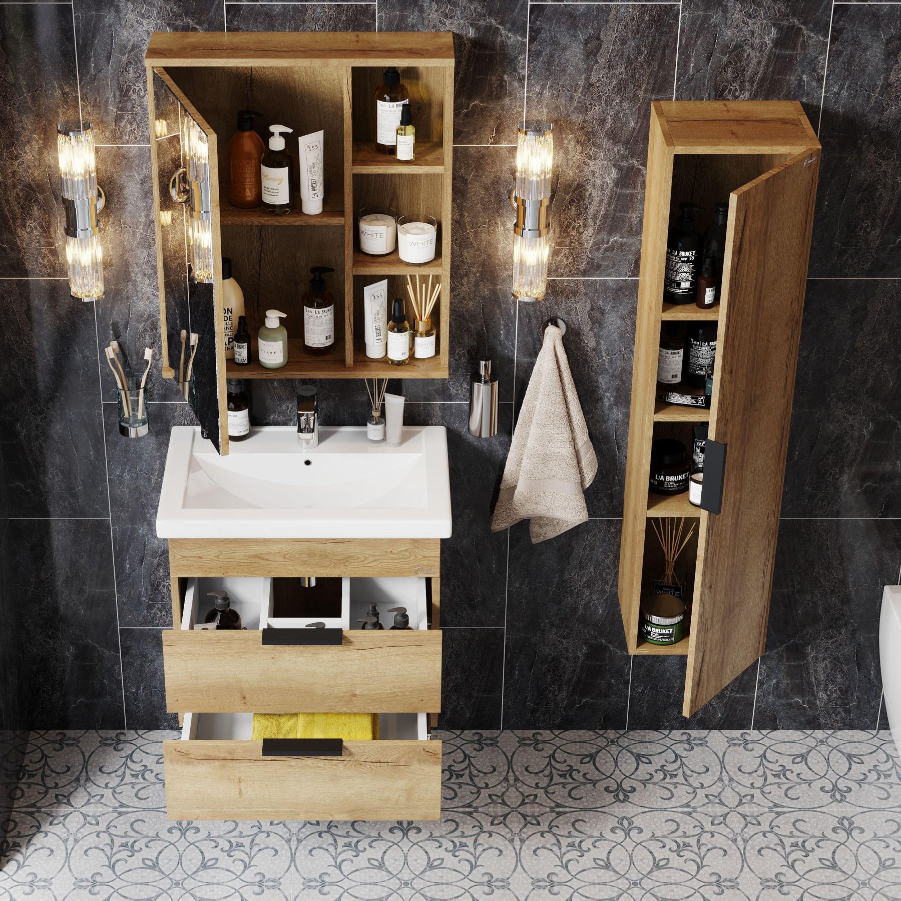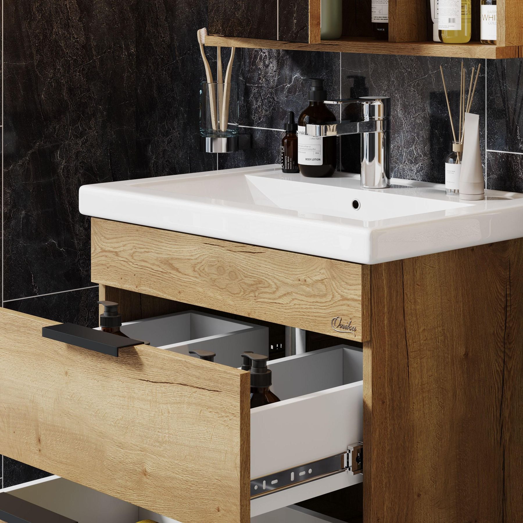 Подвесная тумба для ванной комнаты Onika Легран 60 - это сочетание насыщенного древесного декора и благородства металла: роскошная текстура и натуральный цвет дуба дают теплоту, а матовые металлические ручки добавляют урбанизма и солидности.