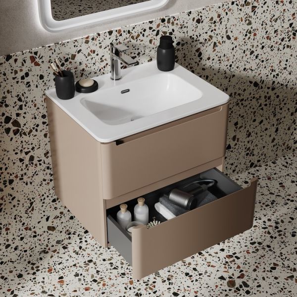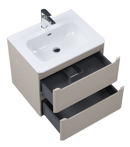 Компактная подвесная тумба с плоским умывальником Edifice в теплом оттенке капучино – воплощение современного минимализма. Мягкие линии корпуса в сочетании с удобными интегрированными ручками выглядят свежо и актуально. Смотрится аккуратно, легко и не усложняет процесс уборки в ванной благодаря подвесной конструкции.