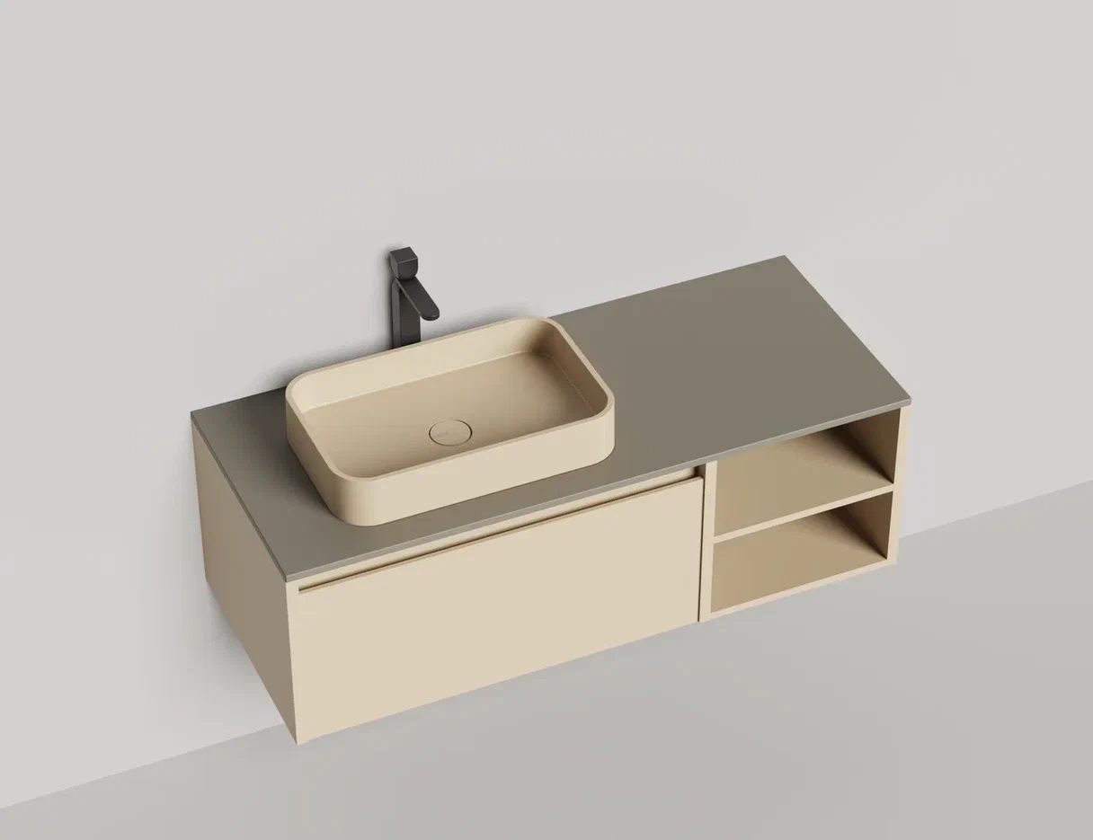 - Тумба и столешница из материала S-Stone в сборе (накладные раковины укомплектованы донным клапаном и поставляются в отдельной коробке)