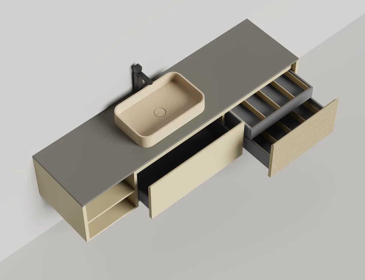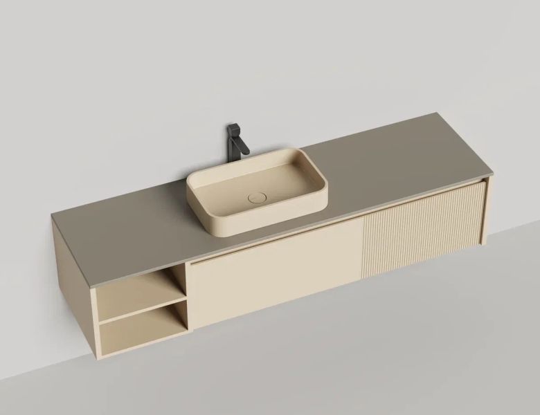 Наполнение для тумбы включает: блоки ячеек для тумб, коврики и комплект внутренней подсветки, которые помогут организовать пространство и создать более удобный доступ к вещам.Тумба DOMINO, дополненная столешницей COSTA из каменного литья S-Stone, гарантирует практичность и простоту ухода.