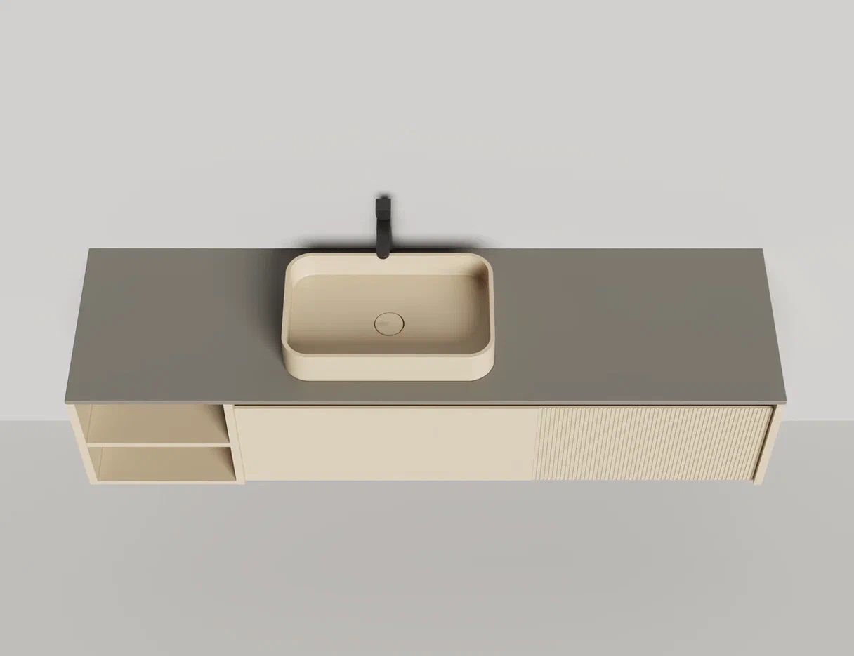 - Тумба и столешница из материала S-Stone в сборе (накладные раковины укомплектованы донным клапаном и поставляются в отдельной коробке)