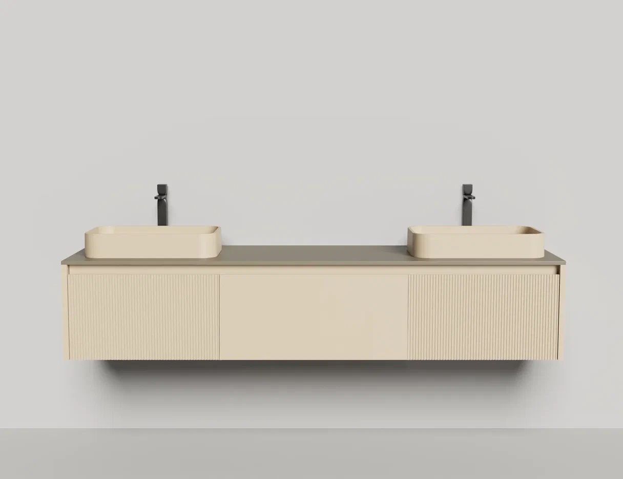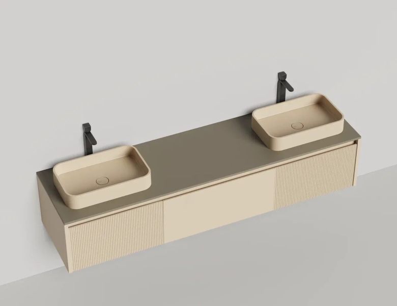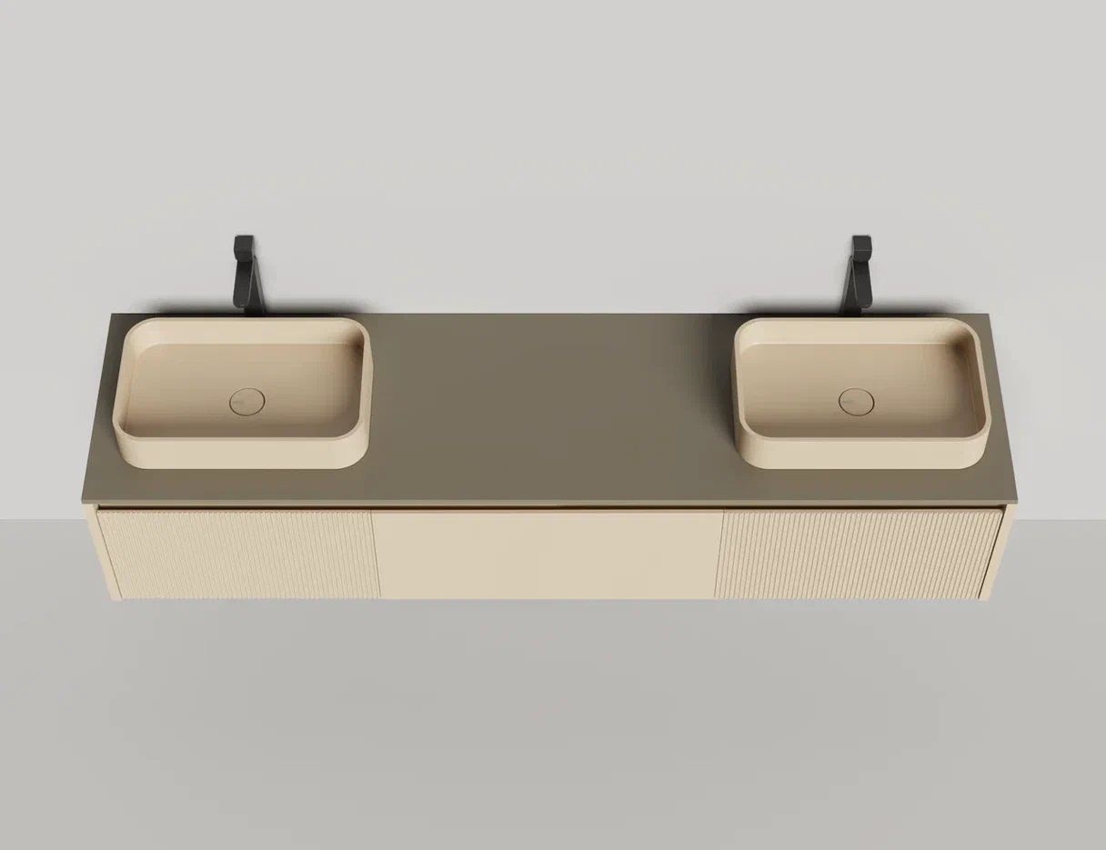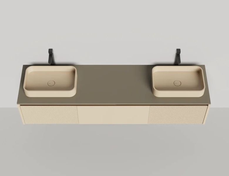- Тумба и столешница из материала S-Stone в сборе (накладные раковины укомплектованы донным клапаном и поставляются в отдельной коробке)