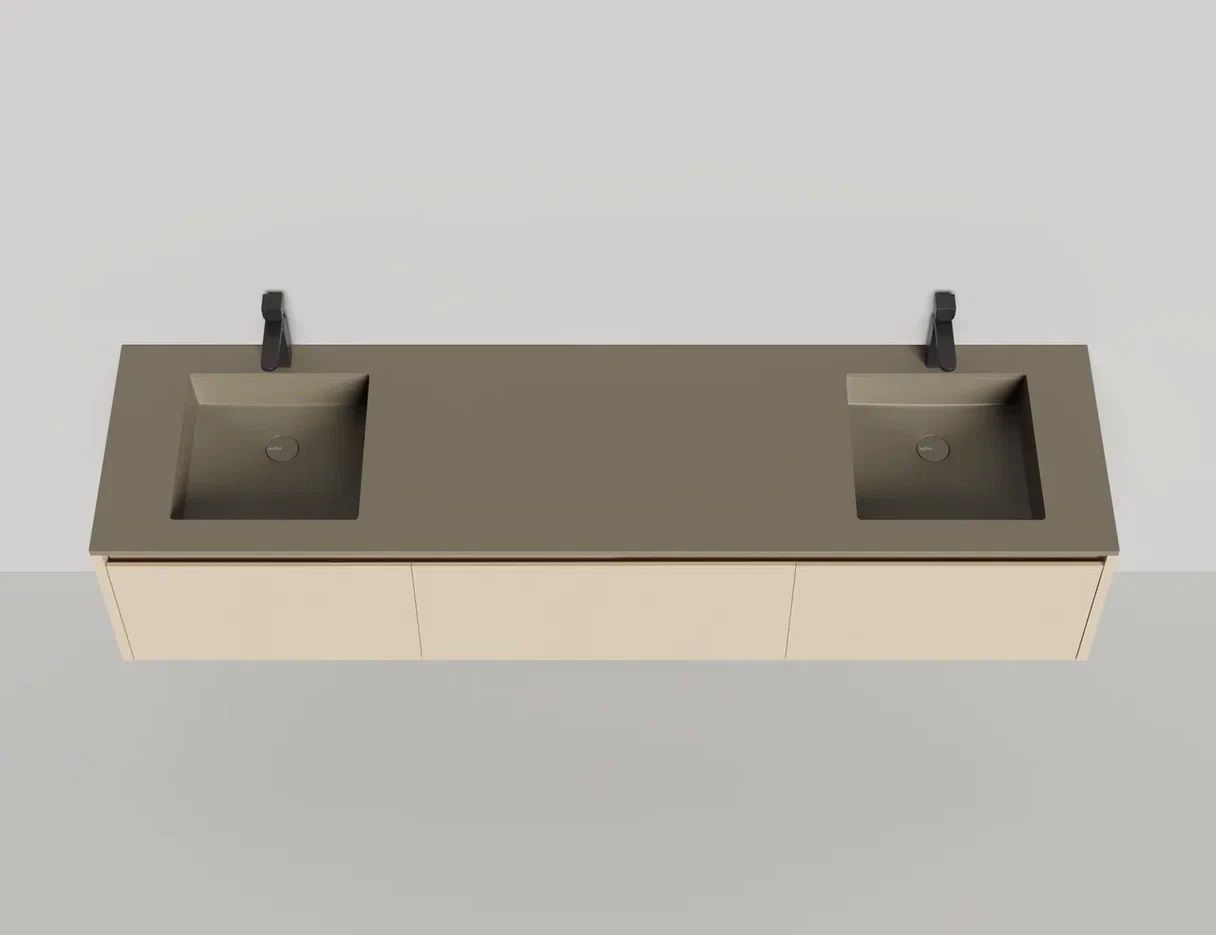 • Тумба и столешница из материала S-Stone в сборе (накладные раковины укомплектованы донным клапаном и поставляются в отдельной коробке)