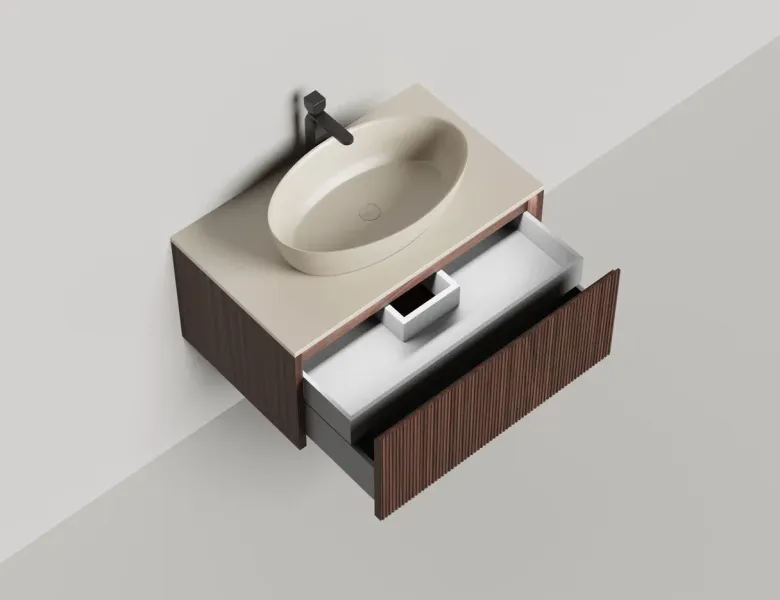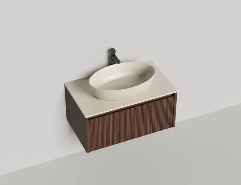• Тумба и столешница из материала S-Stone в сборе (накладные раковины укомплектованы донным клапаном и поставляются в отдельной коробке)