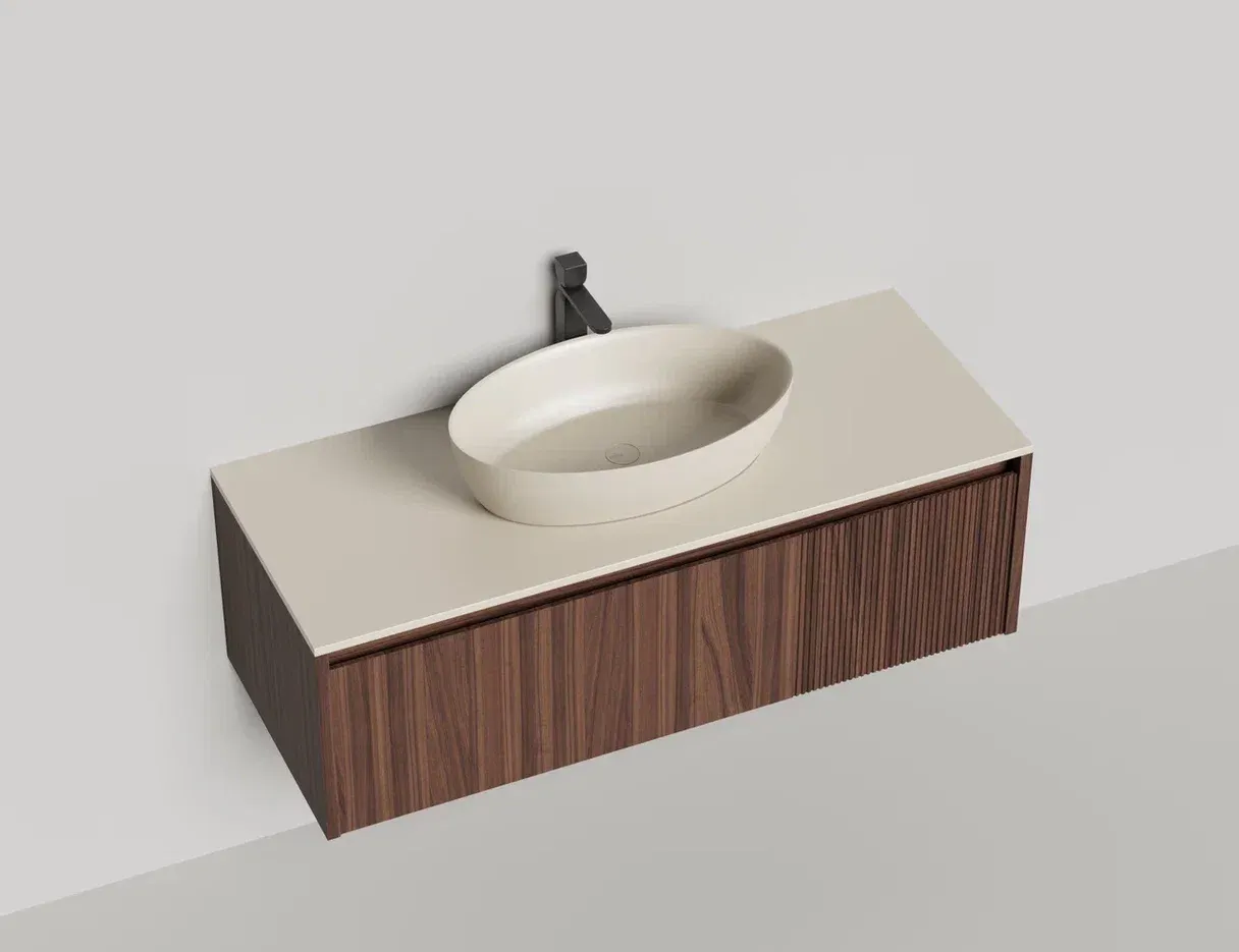 • Тумба и столешница из материала S-Stone в сборе (накладные раковины укомплектованы донным клапаном и поставляются в отдельной коробке)