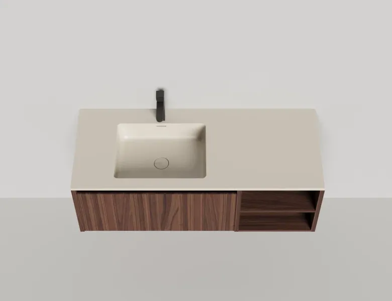 - Тумба и столешница из материала S-Stone в сборе (накладные раковины укомплектованы донным клапаном и поставляются в отдельной коробке)