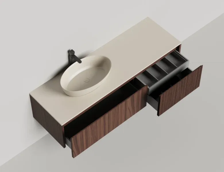 Наполнение для тумбы включает: блоки ячеек для тумб, коврики и комплект внутренней подсветки, которые помогут организовать пространство и создать более удобный доступ к вещам.Тумба DOMINO, дополненная столешницей COSTA из каменного литья S-Stone, гарантирует практичность и простоту ухода.