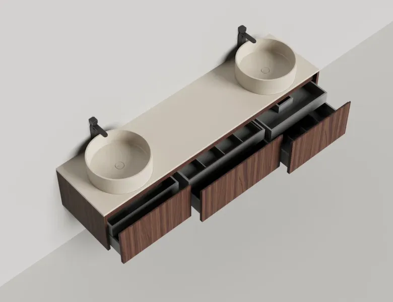 Подвесная тумба DOMINO предназначена для установки со встроенными или накладными раковинами Salini. Она отличается современным дизайном и привлекательным внешним видом. Гладкие и рельефные фасады ящиков в шпоне дерева или в матовом лаке позволяют подобрать комбинацию подходящего размера (ширина от 80 до 200 см) и наполнения.
