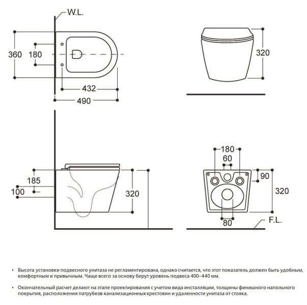 • Прилегание унитаза к стене:
