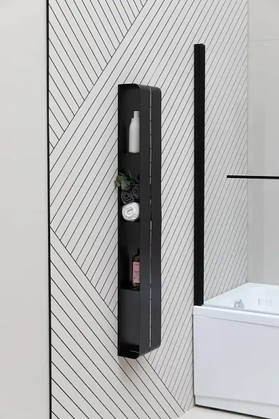 Полка Aquanet Магнум H 20x130 черная матовая, вертикальная - идеальное решение для хранения вещей и аксессуаров в ванной комнате. Она состоит из трех полочек и вертикального каркаса без острых краев и углов. Легкий монтаж полочки для ванной обусловлен идущей в комплекте схемы для точной разметки. Материал настенной полки - нержавеющая сталь толщиной 1,5 мм. Благодаря скрытым креплениям и материалу, полку можно размещать даже в мокрых зонах ванной комнаты без опасений за ее прочность и сохранность.