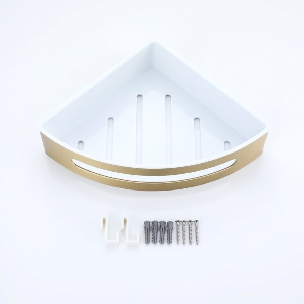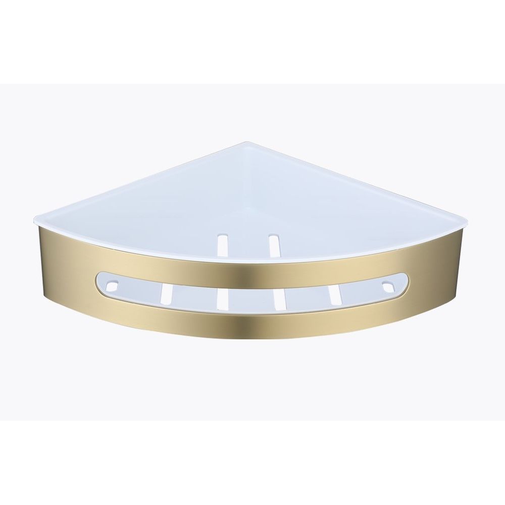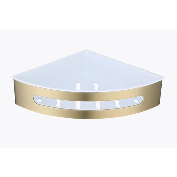 Полка для ванной комнаты угловая Raglo R340.01.03, золотой сатин. Размер: 24,5x22x6,5 см. Тип крепления: на болтах. Материал: нержавеющая сталь, авс-пластик.