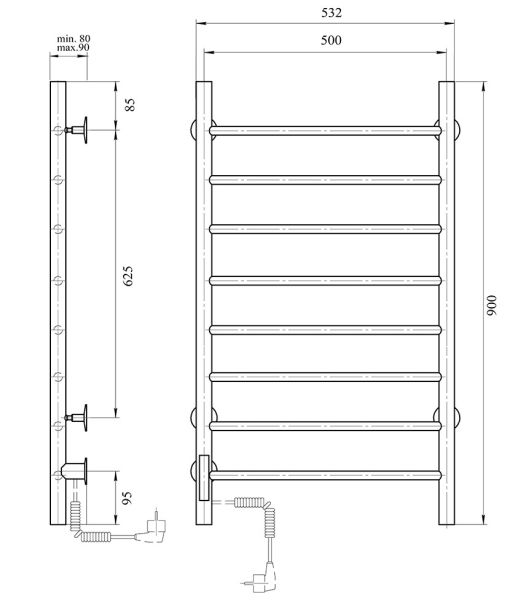 М/о расстояние (межосевое расстояние): 500Количество перекладин: 8Коллекция: АврораТип: электрическиеЦвет: хромМощность, Вт: 300Ширина (мм): 532Высота (мм): 900Глубина (мм): 90/80Вес: 5,15Объем: 0,0425Тэн/подключение: слеваСтрана: РоссияГарантия: 2 года