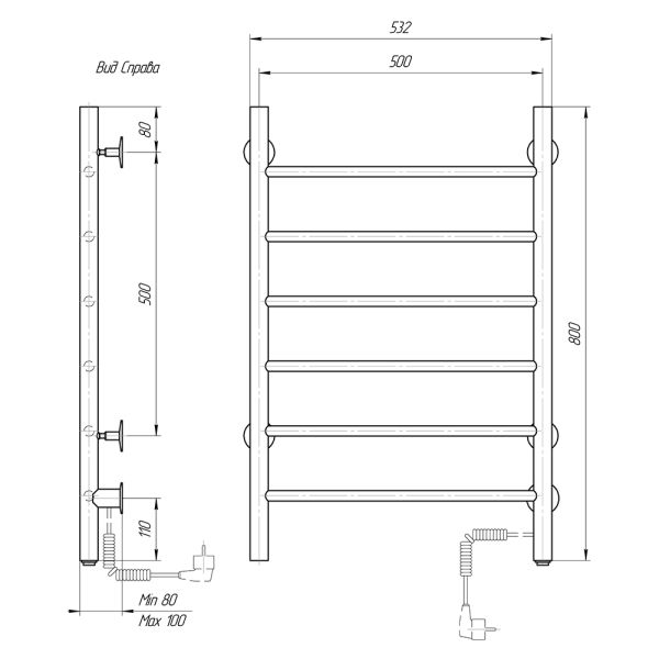 М/о расстояние (межосевое расстояние): 500Количество перекладин: 6Коллекция: КлассикТип: электрическиеЦвет: черныйМощность, Вт: 72Ширина (мм): 500Высота (мм): 800Глубина (мм): 80-100Вес: 4,86Объем: 0,07425Тэн/подключение: справаСтрана: РоссияГарантия: 2 года