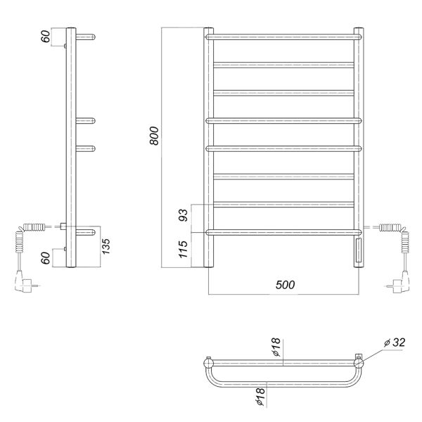 М/о расстояние (межосевое расстояние): 500Количество перекладин: 8Коллекция: ОрфейТип: электрическиеЦвет: черныйМощность, Вт: 100Ширина (мм): 532Высота (мм): 800Глубина (мм): 165-175Вес: 4,2Объем: 0,04Тэн/подключение: справаСтрана: РоссияГарантия: 2 года