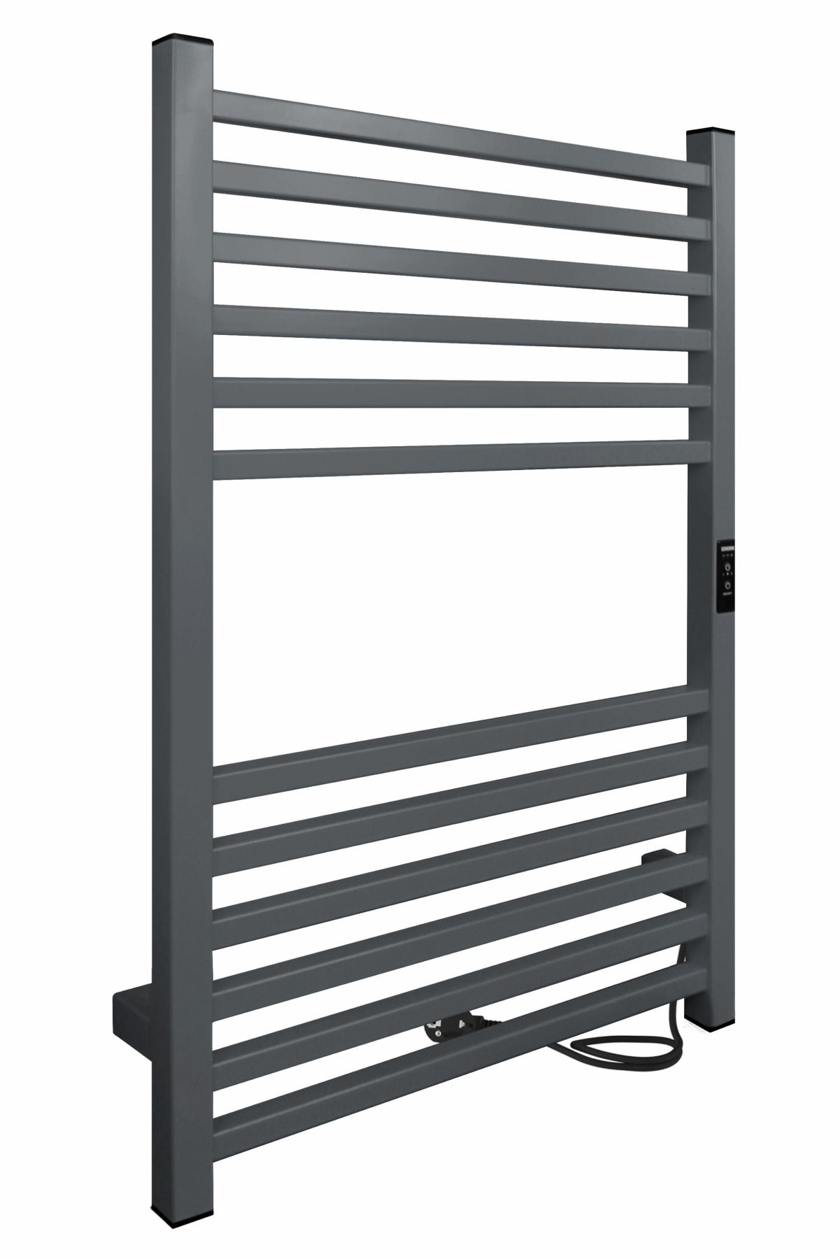 Полотенцесушитель электрический INDIGO Attic в расцветке «Magnetic Grey». Данная модель дополнена терморегулятором нагрева с тремя режимами: 40, 45, 50 градусов и таймером на отключение через 2, 4, 6 часов.