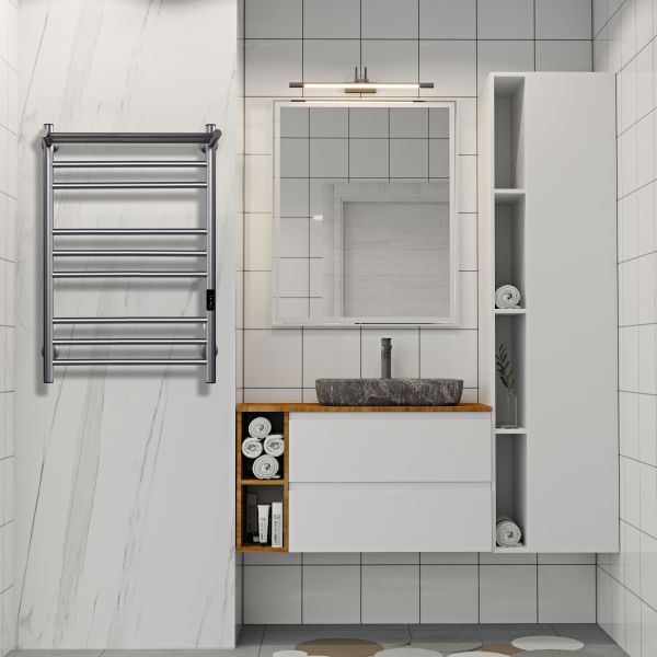 Полка на изделии обеспечит компактное хранение дополнительных халатов и полотенец. Хорошо просушивает текстиль, за счет большого количества перекладин, и предотвращает появление конденсата и повышенной влажности.
