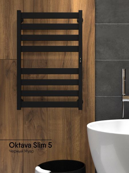 Полотенцесушитель Oktava Slim 5 в оттенке «Черный Муар» идеально впишется в интерьер ванной комнаты в светлых тонах или в стиле loft. Встроенный терморегулятор нагрева имеет три режима: 40, 45, 50 градусов и таймер на отключение через 2, 4, 6 часов.