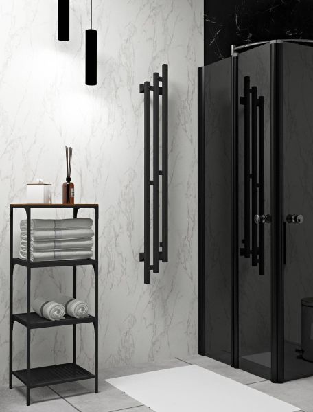 Полотенцесушитель Sky PRO в оттенке Черный Муар имеет встроенный терморегулятор и настраиваемый таймер на отключение. С ним можно установить комфортную температуру, выбрав один из трех режимов, 40,45, 50 градусов.  Нержавеющий полотенцесушитель очень функциональный, он предотвратит появление лишней влажности и плесени, просушит текстильные изделия, а дополнительные крючки послужат вешалкой для полотенец, их будет удобно хранить, и они всегда будут сухими.