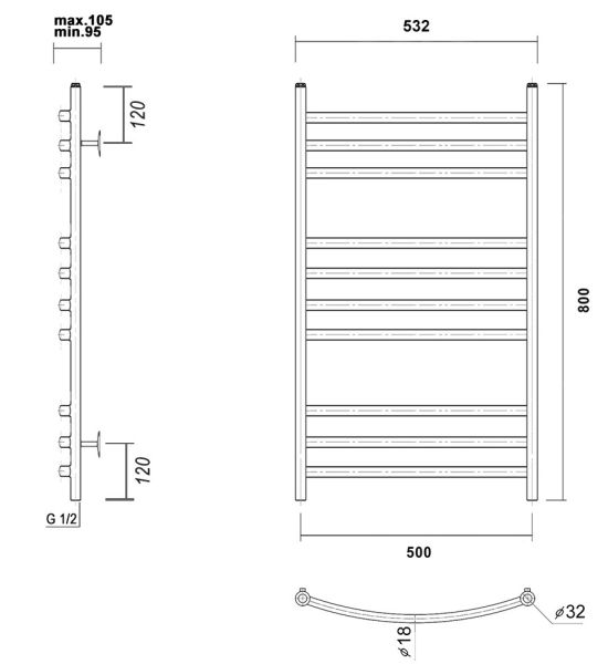 М/о расстояние (межосевое расстояние): 500Количество перекладин: 10Коллекция: КалипсоТип: водяныеЦвет: хромШирина (мм): 532Высота (мм): 800Глубина (мм): 105-95Вес: 4,95Объем: 0,070Тэн/подключение: нижнееСтрана: РоссияГарантия: 10 лет