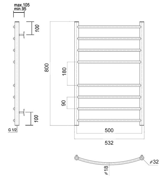М/о расстояние (межосевое расстояние): 500Количество перекладин: 8Коллекция: КалипсоТип: водяныеЦвет: хромШирина (мм): 532Высота (мм): 800Глубина (мм): 105-95Вес: 5,3Объем: 0,070125Тэн/подключение: нижнееСтрана: РоссияГарантия: 10 лет