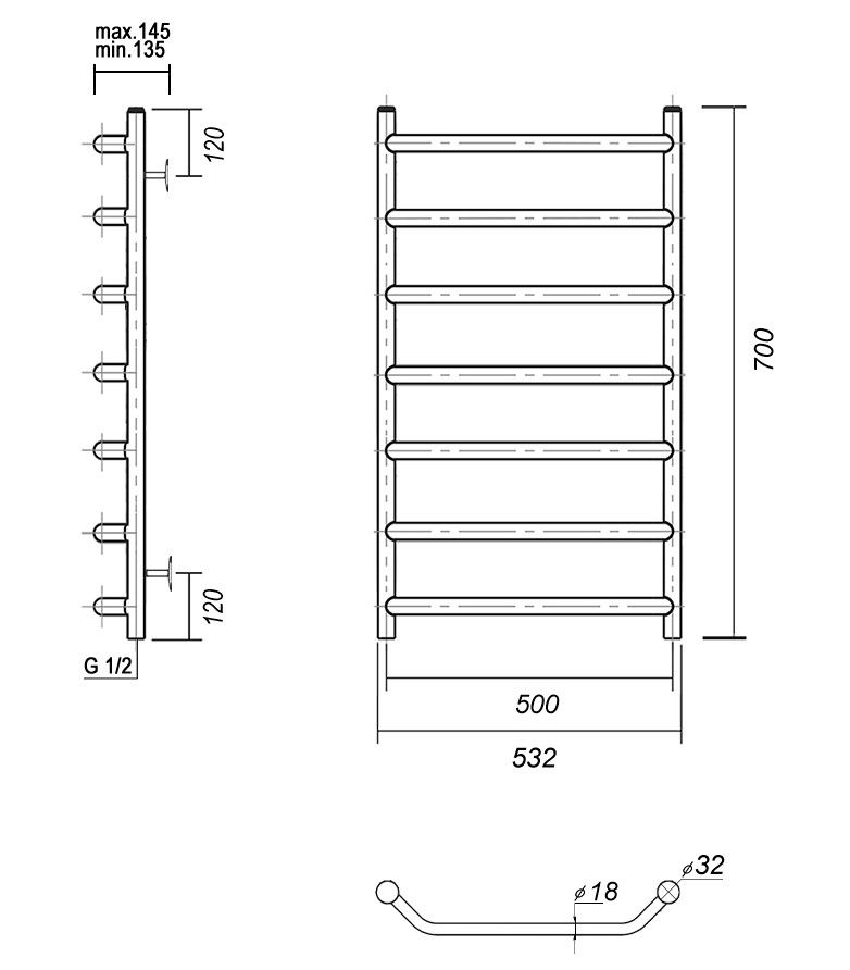 М/о расстояние (межосевое расстояние): 500Количество перекладин: 7Коллекция: ЛаураТип: водяныеЦвет: хромШирина (мм): 532Высота (мм): 700Глубина (мм): 145-135Вес: 5,63Объем: 0,062Страна: РоссияГарантия: 10 лет