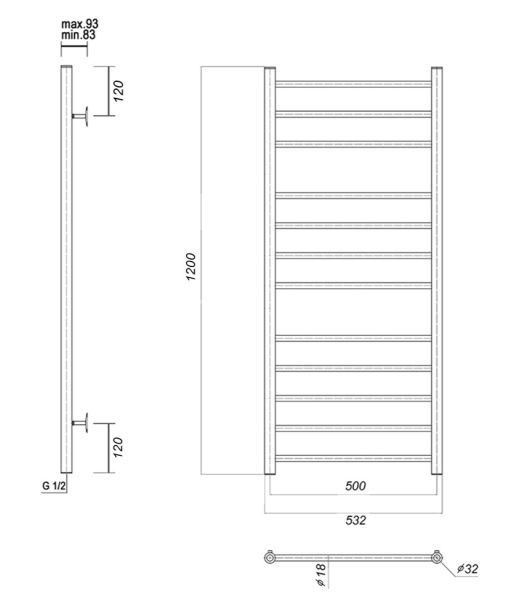 М/о расстояние (межосевое расстояние): 500Количество перекладин: 12Коллекция: МедеяТип: водяныеЦвет: хромШирина (мм): 532Высота (мм): 1200Глубина (мм): 90/80Вес: 7,8Объем: 0,0574Тэн/подключение: нижнееСтрана: РоссияГарантия: 10 лет
