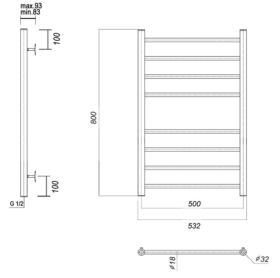М/о расстояние (межосевое расстояние): 500Количество перекладин: 8Коллекция: МедеяТип: водяныеЦвет: хромШирина (мм): 532Высота (мм): 800Глубина (мм): 93-83Вес: 5,4Объем: 0,04Страна: РоссияГарантия: 10 лет