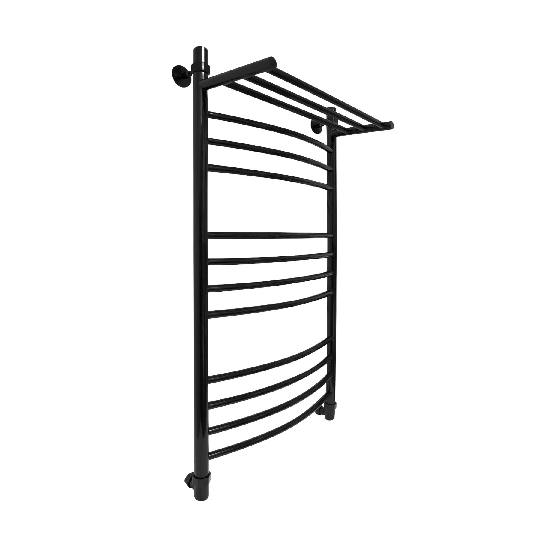 Водяной полотенцесушитель Energy Prestige Modus 1000x500 RAL 9005 (черный матовый) - «лесенка c полкой» c выпуклыми перемычками, размещёнными группами. Дополнительная обогреваемая полка с 3 перекладинами увеличивает тепловую мощность и полезную площадь прибора, а также позволяет максимально удобно располагать на нем вещи для просушивания. Используется во всех системах горячего водоснабжения и отопления с рабочим давлением 3 - 15 атм при температуре теплоносителя до 105°С.Межцентровое расстояние: 1000 мм (+/-5 мм) при боковом и диагональном подключении, 500 мм (+/-5 мм) при нижнем подключении.В комплектацию входят эксцентрики, позволяющие отрегулировать межцентровое расстояние.Полотенцесушитель изготовлен из высококачественной импортной пищевой нержавеющей стали марки AISI 304 (08Х18Н10). Поверхность изделия окрашена по технологии цветного порошкового напыления - достоинства этой технологии в том, что получаемые изделия прочны, долговечны и экологичны. Сварка швов выполнена по специальной технологии TIG по международному стандарту EN 10217-7. Полотенцесушитель испытан при давлении 50 атм, составляющая его труба — 150 атм, благодаря чему имеет большой запас прочности.Произведен в России. Гарантийный срок - 5 лет. Комплектуется всем необходимым для монтажа. Вся фурнитура производится итальянской фирмой Smart.Комплектация полотенцесушителя: