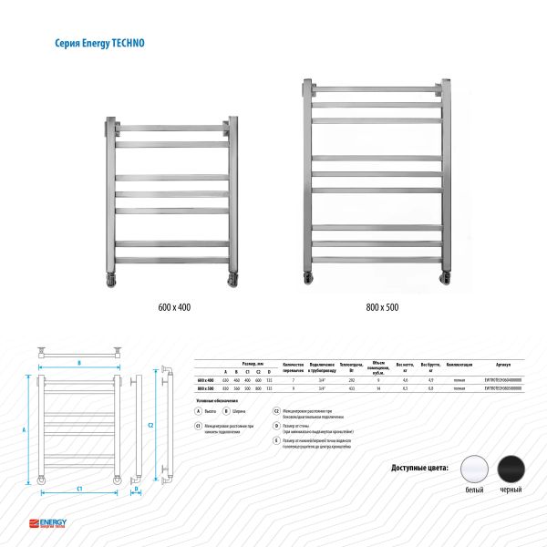 Полотенцесушитель водяной Energy Techno 600x400 RAL 9005 () - лесенка в современном стиле "техно" с необычными перемычками квадратного сечения, выполненная из нержавеющей стали. Используется во всех системах горячего водоснабжения и отопления с рабочим давлением 3 - 15 атм при температуре теплоносителя до 105°С.Межцентровое расстояние: 600 мм (+/-5 мм) при боковом и диагональном подключении, 400 мм (+/-5 мм) при нижнем подключении.В комплектацию входят эксцентрики, позволяющие отрегулировать межцентровое расстояние.Полотенцесушитель изготовлен из высококачественной импортной пищевой нержавеющей стали марки AISI 304 (08Х18Н10). Поверхность изделия окрашена по технологии цветного порошкового напыления - достоинства этой технологии в том, что получаемые изделия прочны, долговечны и экологичны. Сварка швов выполнена по специальной технологии TIG по международному стандарту EN 10217-7. Полотенцесушитель испытан при давлении 50 атм, составляющая его труба — 150 атм, благодаря чему имеет большой запас прочности.Произведен в России. Гарантийный срок - 5 лет.