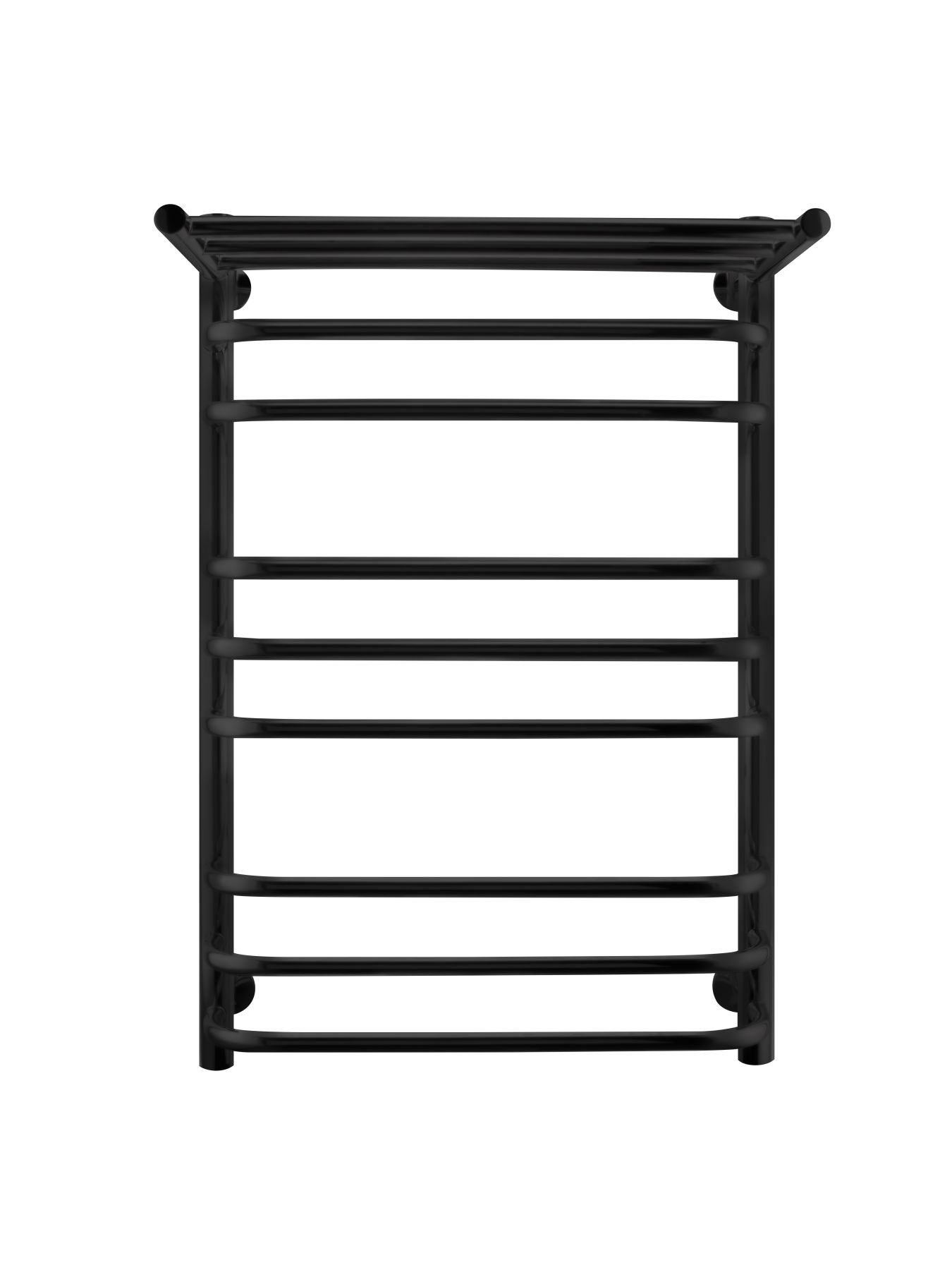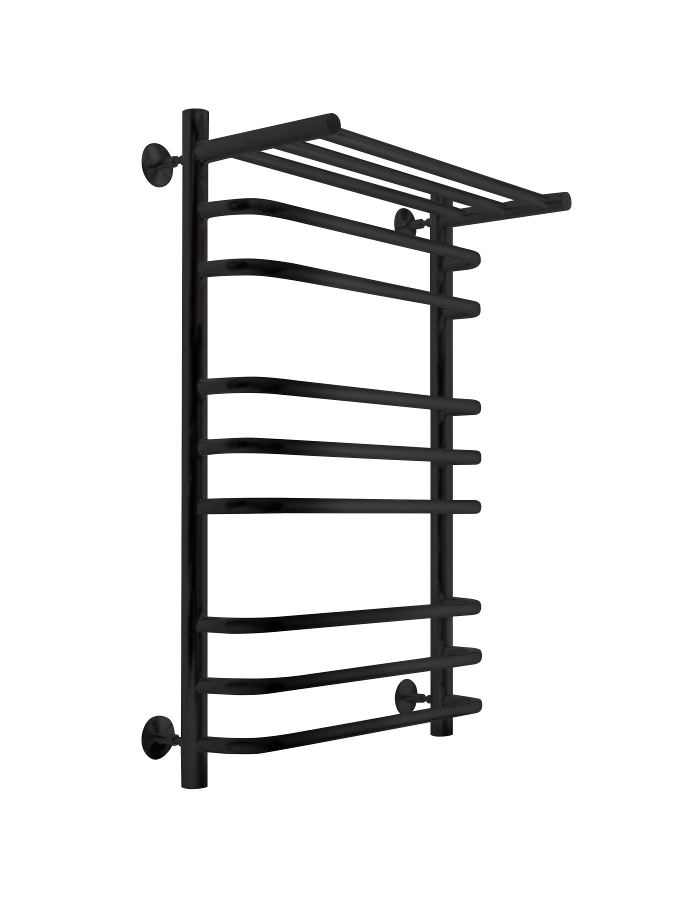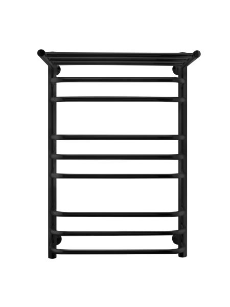 Полотенцесушитель Brace с полкой выполнен в оттенке «Черный муар». Удобен в использовании. Большое количество перекладин позволяет сушить достаточное количество изделий.  Водяные полотенцесушители для ванной хорошо справляются со своей задачей, они предотвращают повышенную влажность в ванной комнате и предотвращают появление плесени и грибка.