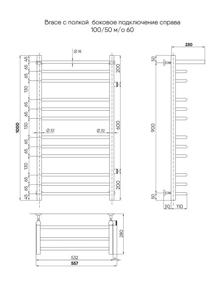 Полотенцесушитель водяной INDIGO Brace с полкой со скобообразными перекладинами и боковым подклю... Подробнее