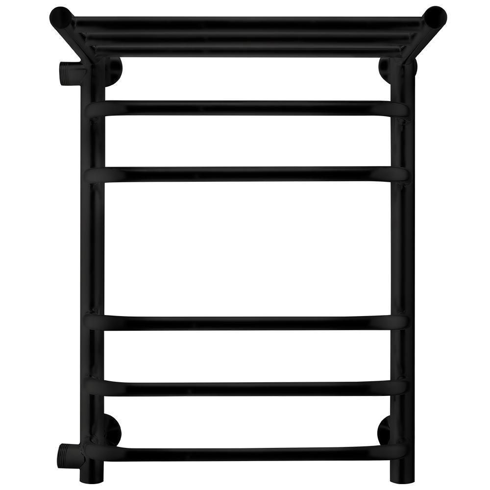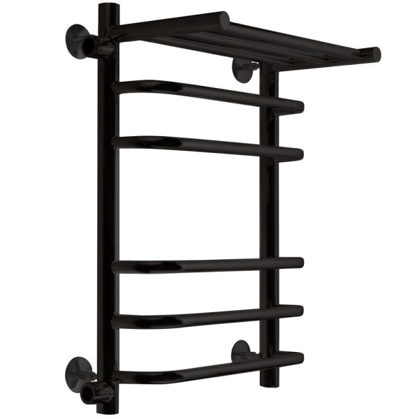 Полотенцесушитель водяной INDIGO Brace с полкой со скобообразными перекладинами и боковым подключением, выполнен в цвете «Черный Муар».  Полотенцесушитель с полками одна из самых популярных моделей, так как она позволяет дополнительно разместить на изделии полотенца и халаты.